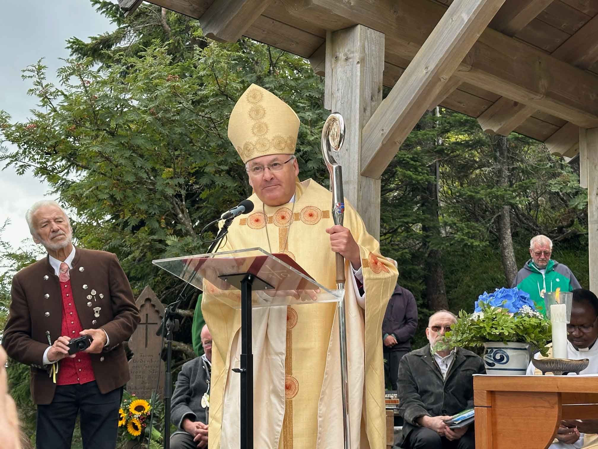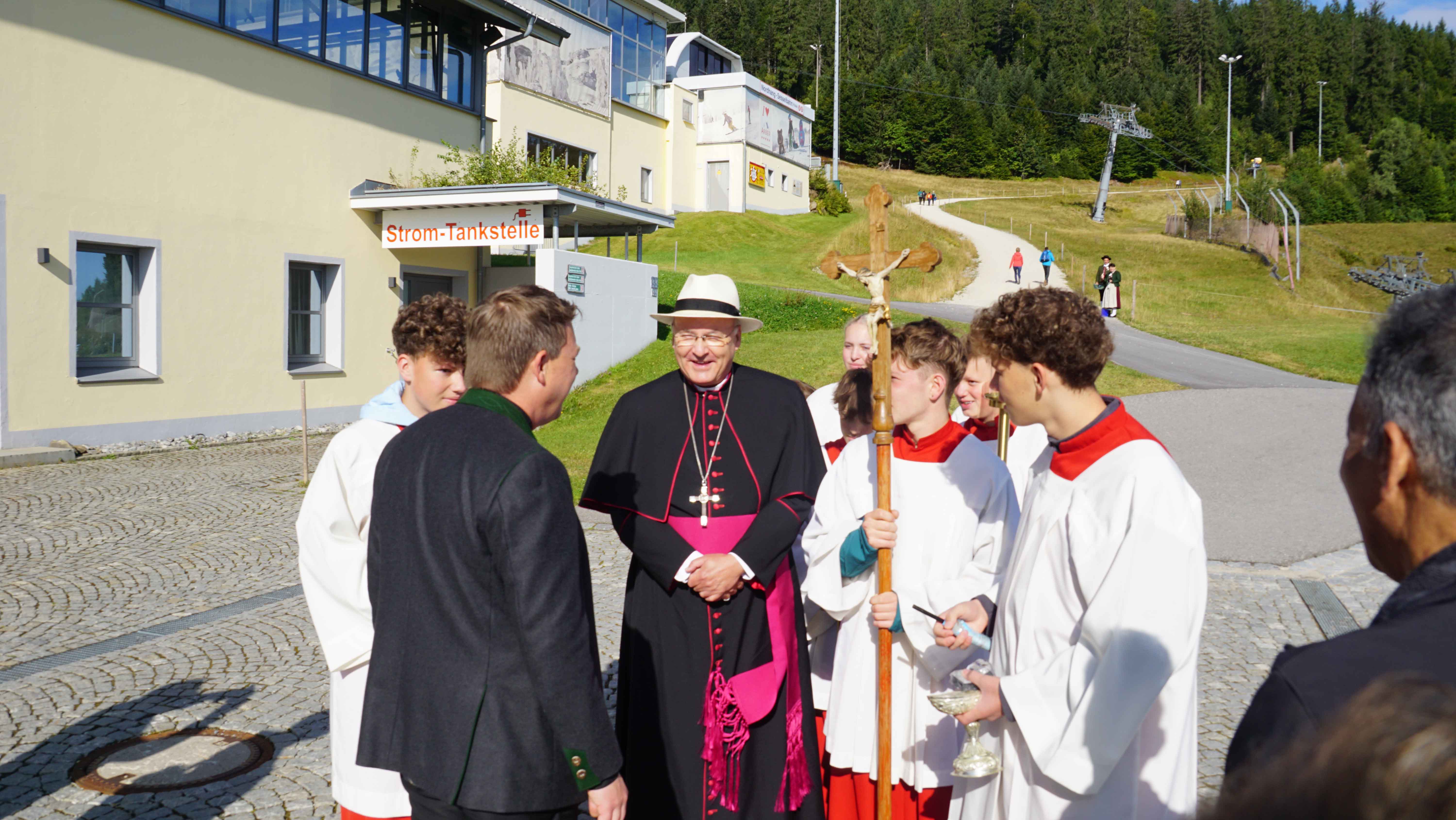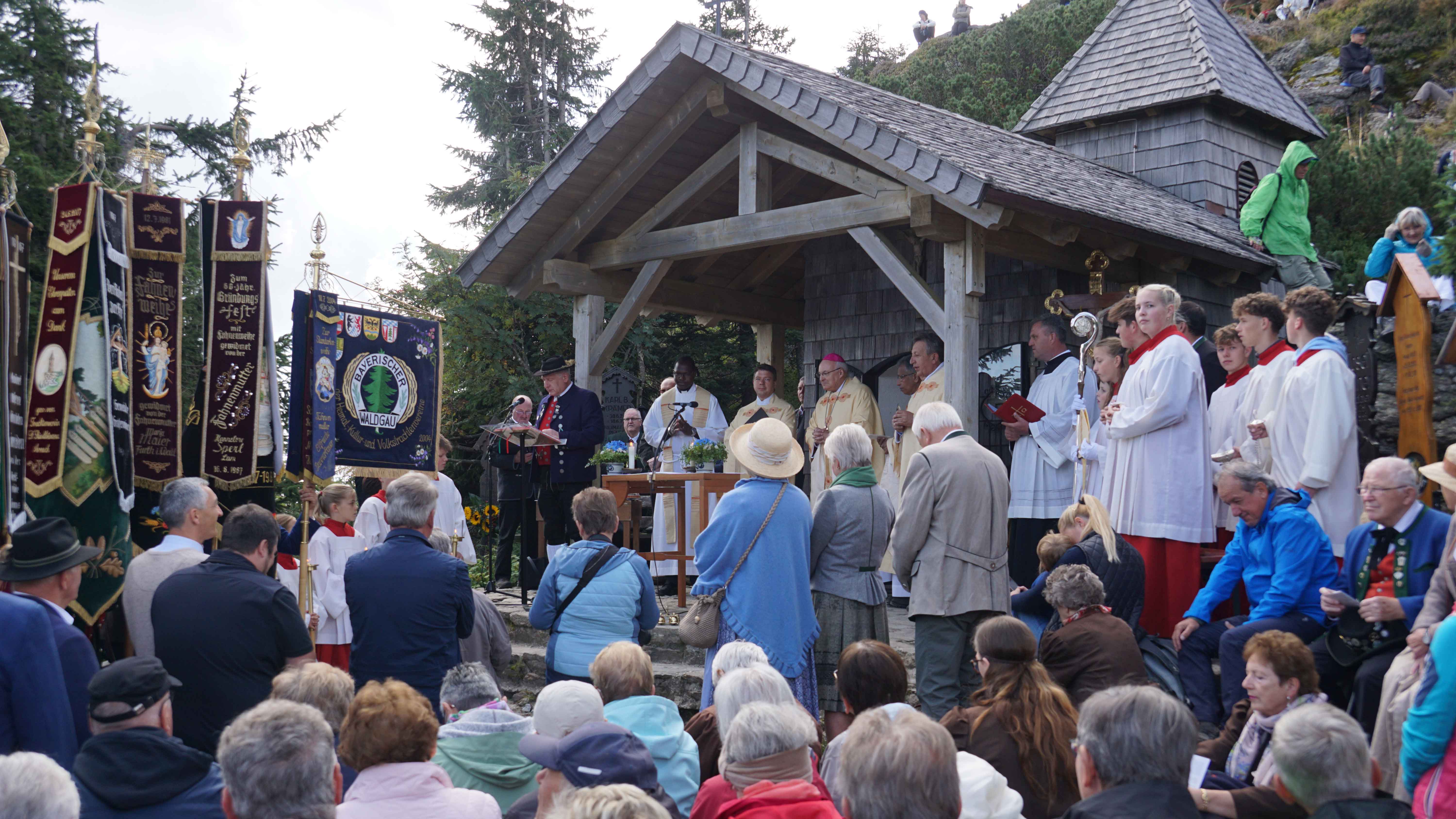 Pfarrer Alexander Kohl begrüßte Bischof Dr. Rudolf Voderholzer an der Talstation, dann ging es mit der Bischofsgondel hinauf auf die Bergstation des Großen Arber. Nach einer großen feierlichen Prozession mit den Fahnenabordnungen, die von der Seilbahn zur Arberkaplle den Rosenkranz beteten, ging es dann zur kleinen St. Bartholomäus-Kapelle. Nach der Begrüßung durch Andreas Tax, 1. Gauvorstand der Trachtenvereine und Veranstalter, feierte Bischof Rudolf gemeinsam mit Arberpfarrer Alexander Kohl, Pfarrvikar Francis Karippukattil, Diakon Josef Schlecht und Abbé Felix, Priester aus Burkina Faso, derzeit Student im Koster Melk, den Festgottesdienst.