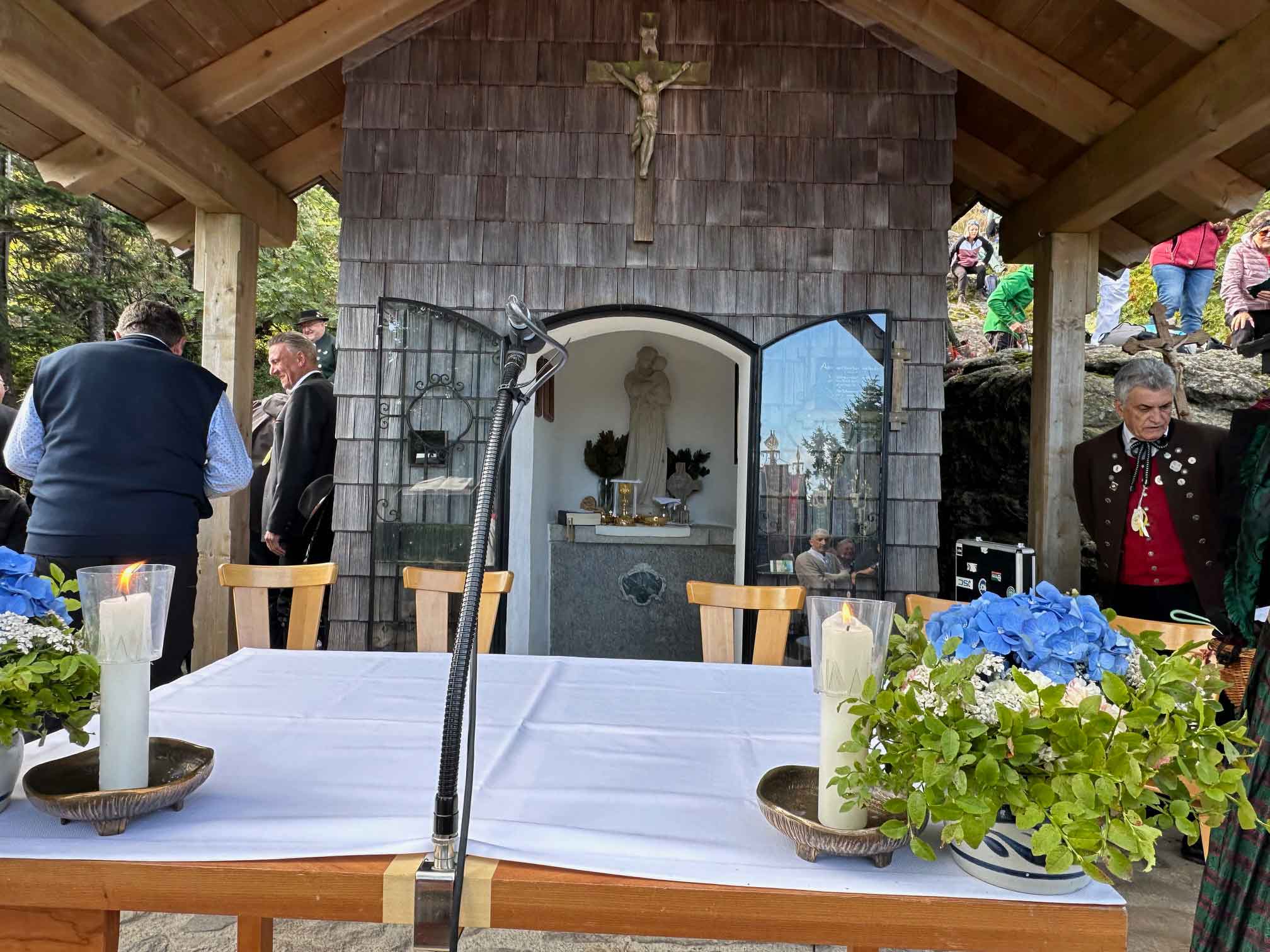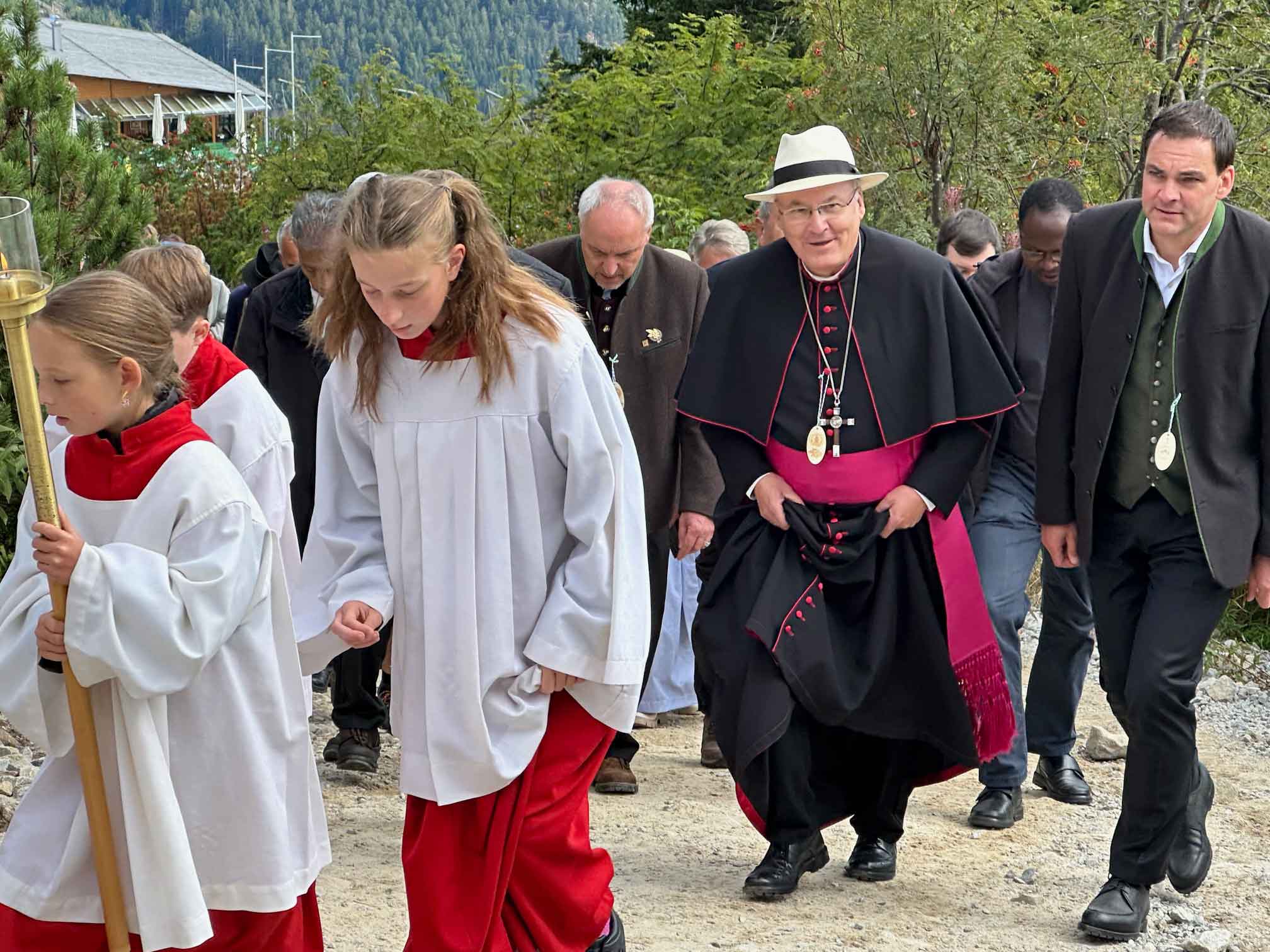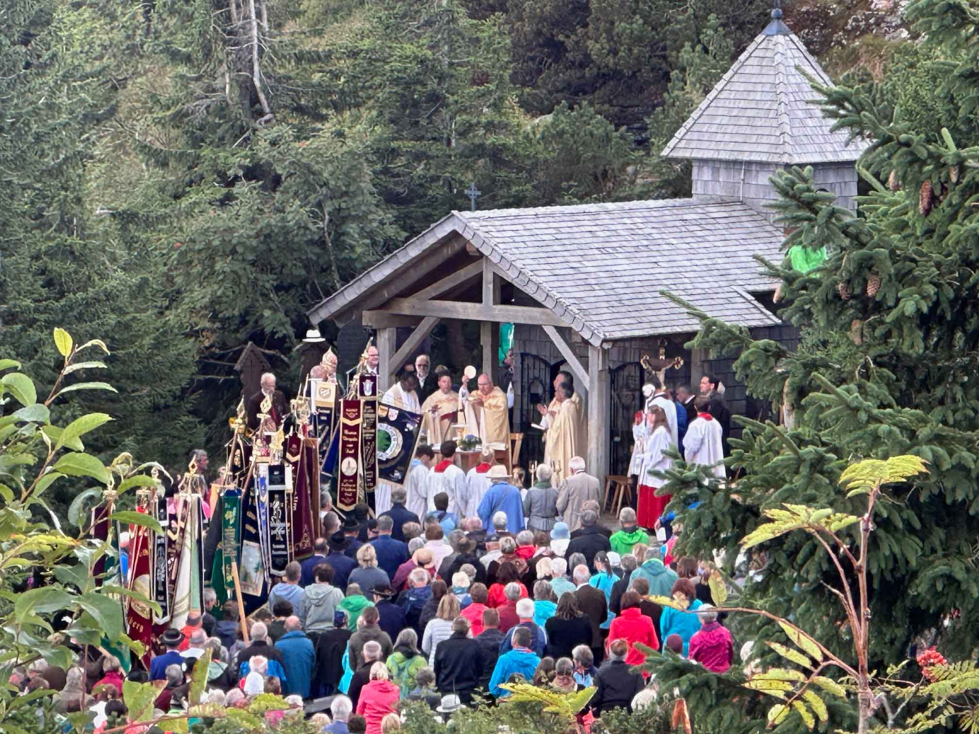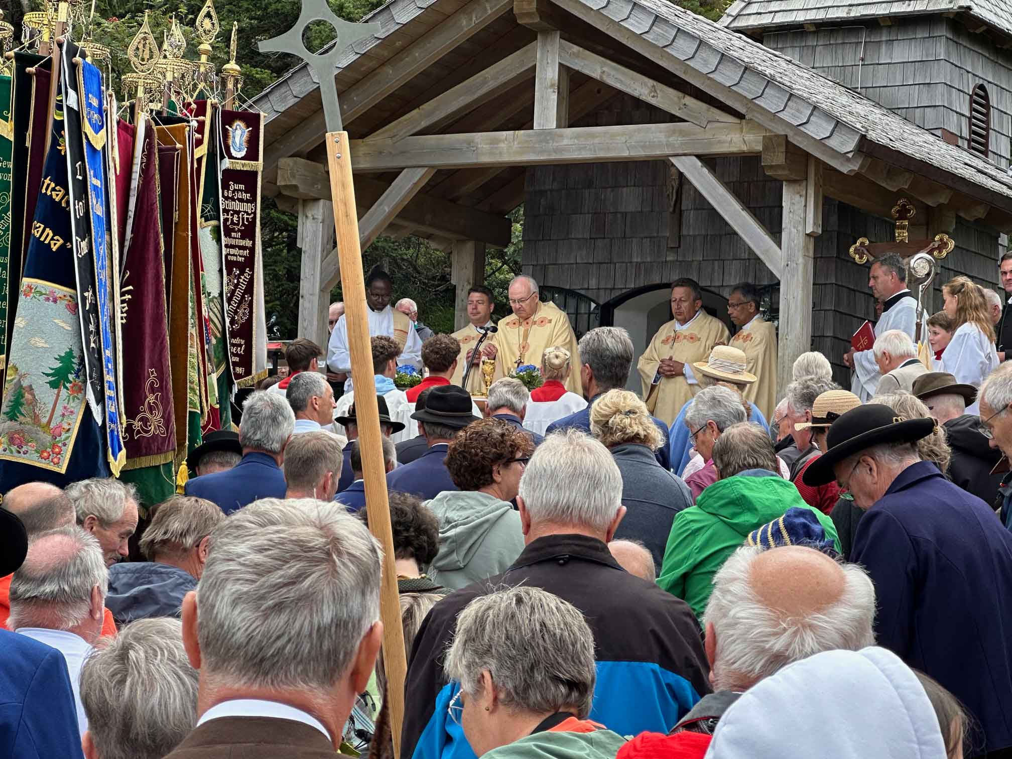 Pfarrer Alexander Kohl begrüßte Bischof Dr. Rudolf Voderholzer an der Talstation, dann ging es mit der Bischofsgondel hinauf auf die Bergstation des Großen Arber. Nach einer großen feierlichen Prozession mit den Fahnenabordnungen, die von der Seilbahn zur Arberkaplle den Rosenkranz beteten, ging es dann zur kleinen St. Bartholomäus-Kapelle. Nach der Begrüßung durch Andreas Tax, 1. Gauvorstand der Trachtenvereine und Veranstalter, feierte Bischof Rudolf gemeinsam mit Arberpfarrer Alexander Kohl, Pfarrvikar Francis Karippukattil, Diakon Josef Schlecht und Abbé Felix, Priester aus Burkina Faso, derzeit Student im Koster Melk, den Festgottesdienst.