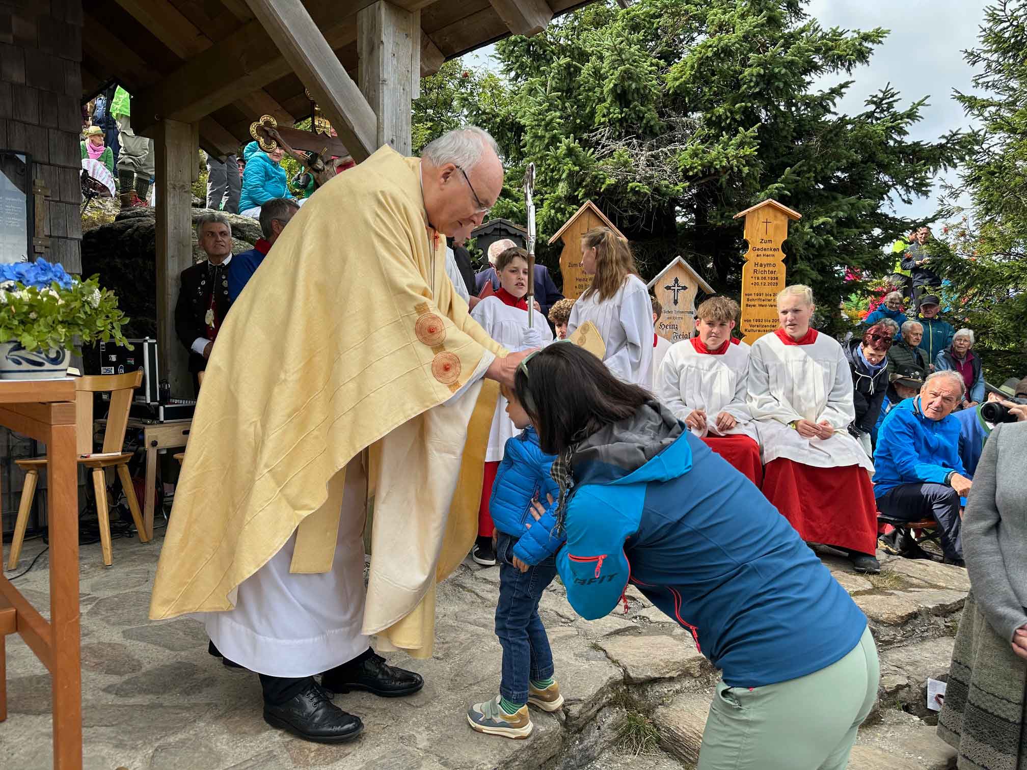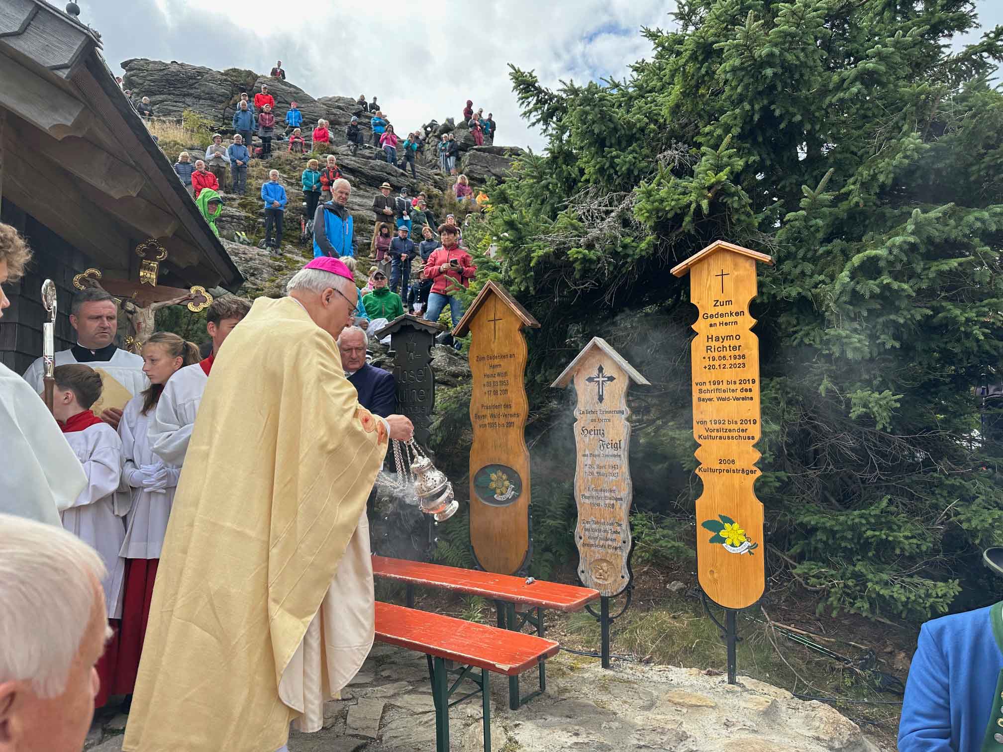 Ein besonderer Moment des Festgottesdienstes war die Segnung eines Totenbretts für den Heimatpfleger Haymo Richter, geboren am 19. Juni 1936, verstorben am 20. Dezember 2023: „Er hat sich mit großem Engagement, mit viel Wissen und Liebe für die Natur und Kultur des Bayerischen Waldes eingesetzt“, würdigte Bischof Rudolf sein Lebenswerk. „Möge der Herr, der am Kreuz die Arme ausgebreitet hat, auch ihn in seine Herrlichkeit aufnehmen und ihm vergelten, was er für seine Heimat und für die Bedürftigen getan hat.“