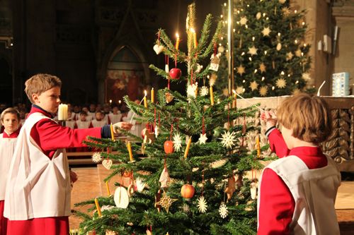 Bischof Rudolf Voderholzer hat die Christmette in der Heiligen Nacht mit den Gläubigen im vollbesetzten Regensburger Hohen Dom St. Peter gefeiert. Die Regensburger Domspatzen unter der Leitung von Domkapellmeister Roland Büchner gestalteten den Gottesdienst auf höchstem musikalischem Niveau. Erstmals war vor dem Hauptaltar am Vortragekreuz ein Christbaum aufgestellt, geschmückt mit Äpfeln, Strohsternen, Lebkuchen und Kerzen. Mehrere Domspatzen entzündeten die Wachskerzen an dem Baum mit dem Feuer des Friedenslichtes, das Pfadfinder in den Tagen zuvor aus Bethlehem nach Regensburg gebracht hatten.