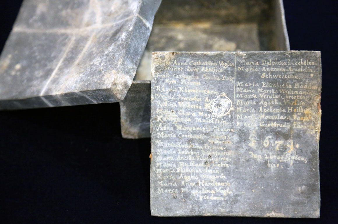 Am Boden des Kästchens kam eine passgenaue Bleiplatte zum Vorschein, die eine weiße Beschriftung trägt und mit der Schauseite nach unten eingelegt war. Sie entschlüsselt die Frage nach der genauen Datierung und den Auftraggeber(inne)n der Grundsteinlegung.